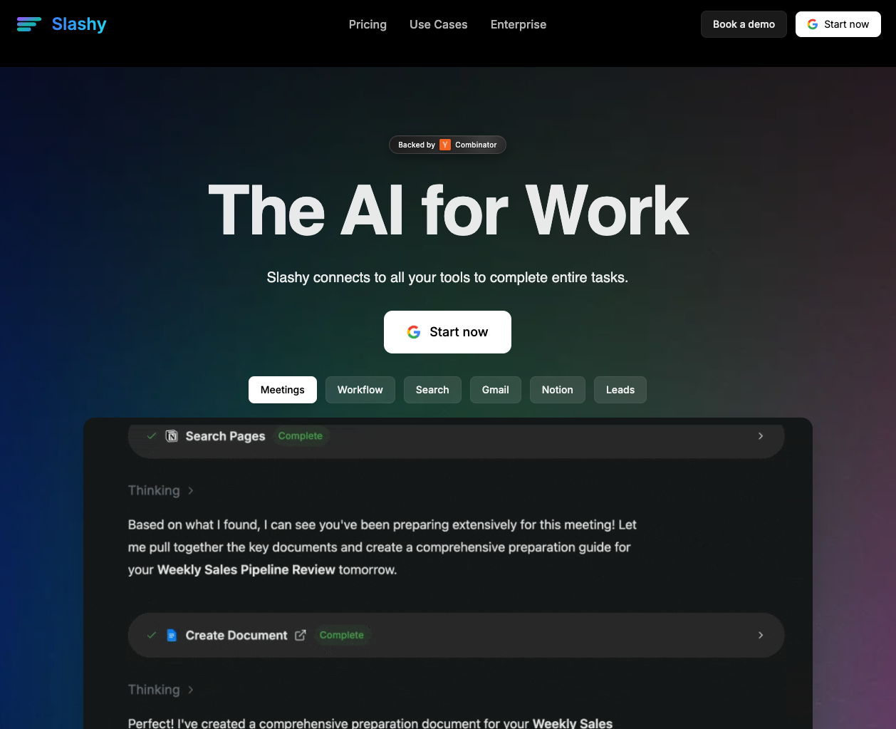 Slashy è una startup backuppata dall'incubatore più famoso al mondo, YCombinator. Permette di collegare tutti i tuoi servizi (Google Calendar, Drive, Notion, ecc.) e consente di eseguire task lunghi e complessi operando su trasversalmente su tutti i software a cui sei registrato.