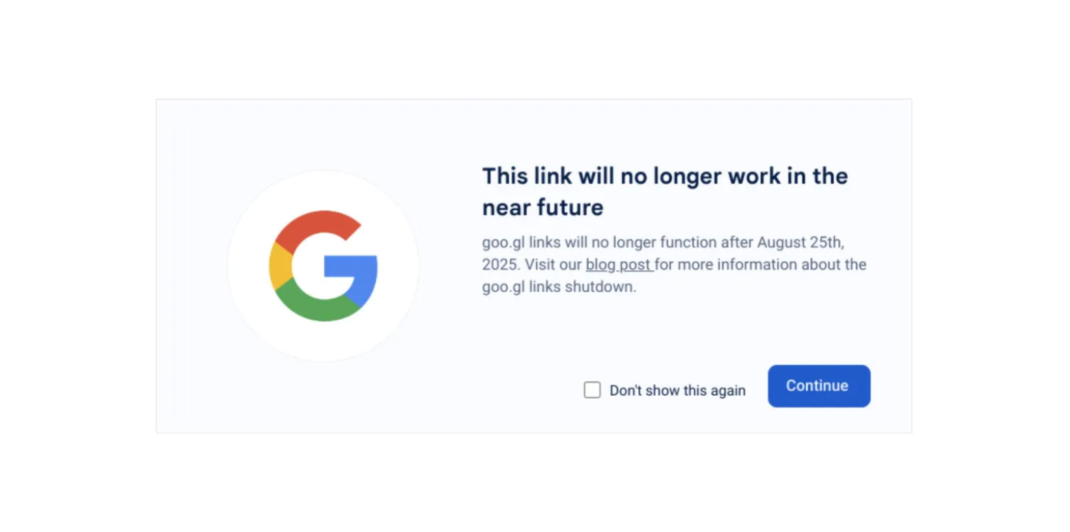 A partire dal 23 agosto 2024, cliccando su un collegamento goo.gl si vedrà un’interstitial page con il messaggio "Questo link non funzionerà più nel prossimo futuro", con possibilità di proseguire cliccando su "Continue". Google avverte che questa interstitial page potrebbe causare interruzioni nei flussi di reindirizzamento, specialmente per chi usa i reindirizzamenti 302 o metadati sociali incorporati.