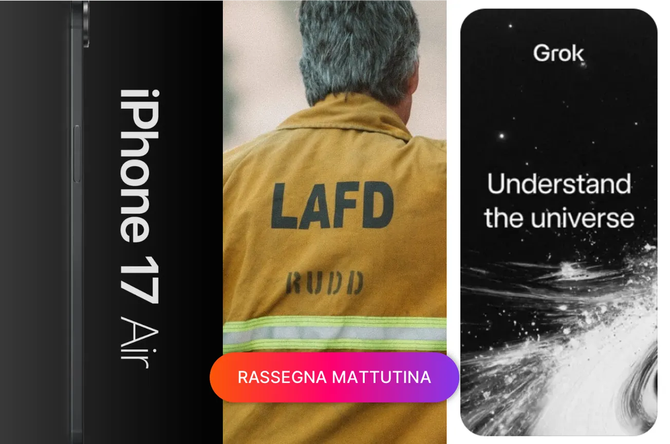 Buon lunedì, un nuovo leak su iPhone 17 Air rivelerebbe il suo spessore di 5.5mm, il più sottile mai costruito in casa Apple. T-Mobile e SpaceX mettono a disposizione una rete satellitare di test per le vittime dell'incendio. Grok approda su iPhone, ma solo negli Stati Uniti. Buona lettura!